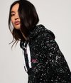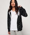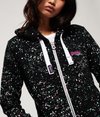Superdry hættetrøje med gennemgående print og lynlås til kvinder fra Orange Label serien. Klassisk hættetrøje med lynlås, snøre, to lommer foran og et broderet Superdry logo på brystet. Læg dertil ribkant på ærmer og forneden og et lille Orange Label Superdry logo på ærmekanten.