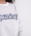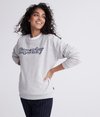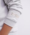 Superdry Serif sweatshirt i loopback-stof med rund hals og applikation til kvinder. Sweatshirt med rund hals, lange ærmer og ribkant på ærmer og forneden. Læg dertil et broderet Superdry logo på brystet, Superdry logo over den ene ærmekant og et Superdry mærke i siden.