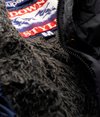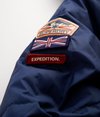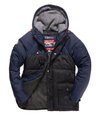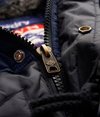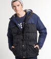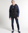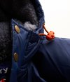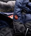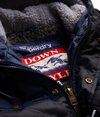 Superdry Retro Mountain frakke med hætte. Retrojakke i to farver med lynlås-, trykknap og duffellukning, seks lommer, Superdry logomærkat på ærmet og to aftagelige logomærkater på ærmet. Både frakke og hætte har fleecefor.