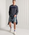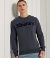 Superdry Core Logo sweatshirt i loopback-stof med imiteret ruskind til mænd. Langærmet Sweatshirt med Core logo, klassisk rund halsudskæring med ribkant og ribkant ved håndled og forneden. Læg dertil et Superdry logo i imiteret ruskind hen over brystet og et Superdry logomærke i den ene side.